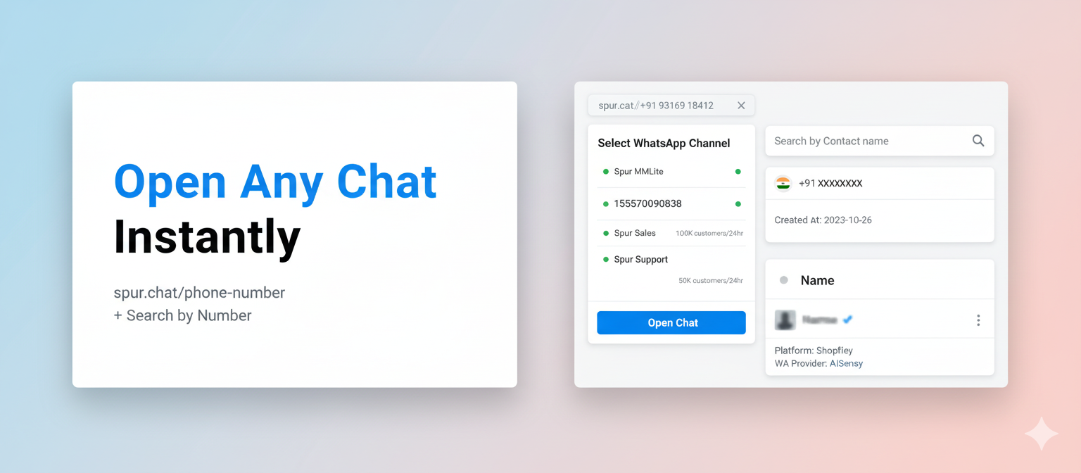 Open any Spur chat instantly with spur.chat/phone-number links. Plus search contacts by phone number in the database. Faster lookups, zero hunting through inboxes.