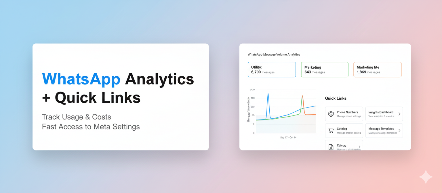 Track WhatsApp message volume by category and country with cost breakdowns. Plus quick links to Meta Business Manager settings. no more hunting through menus