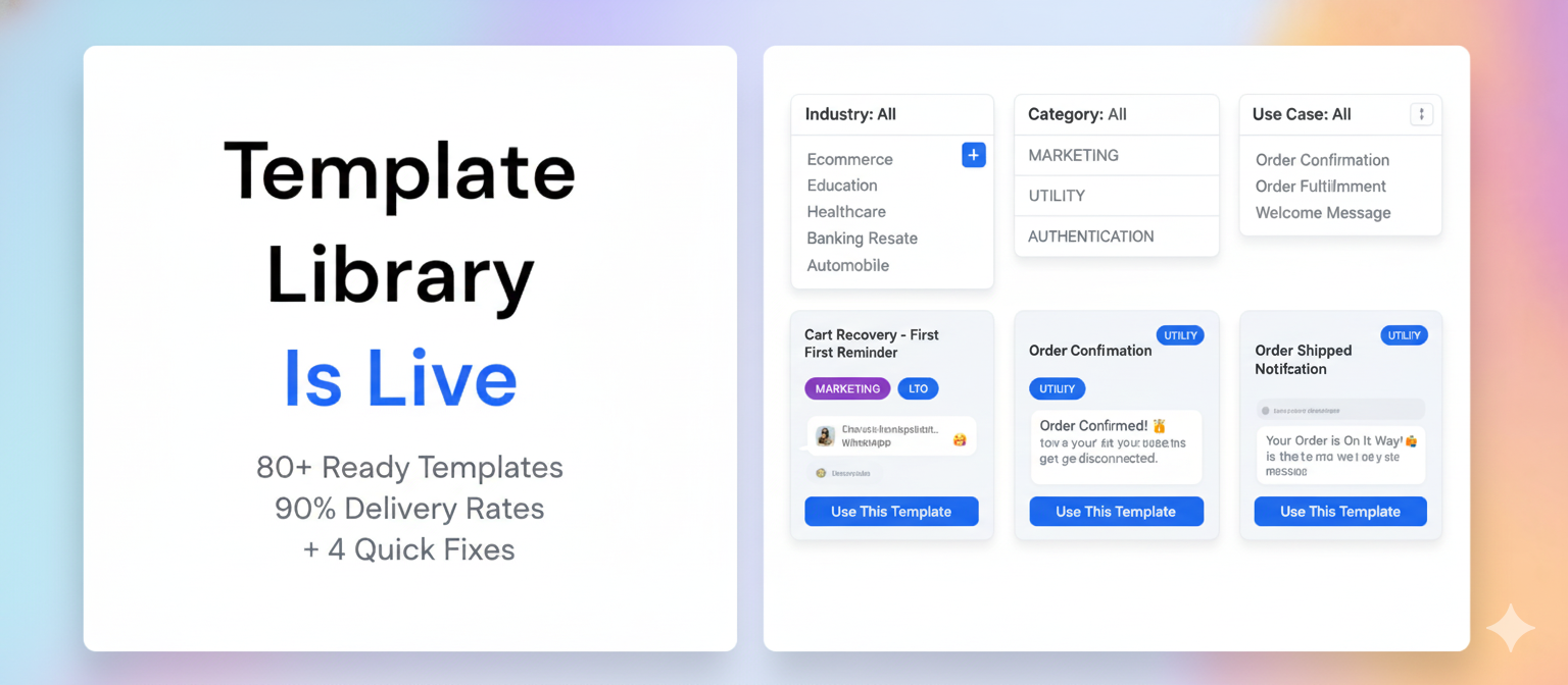 Browse 80+ ready to use WhatsApp templates by industry and use case. Hit 90%+ delivery with utility templates. Plus: duplicate templates, status refresh, rejection reasons, and category warnings, all live now.